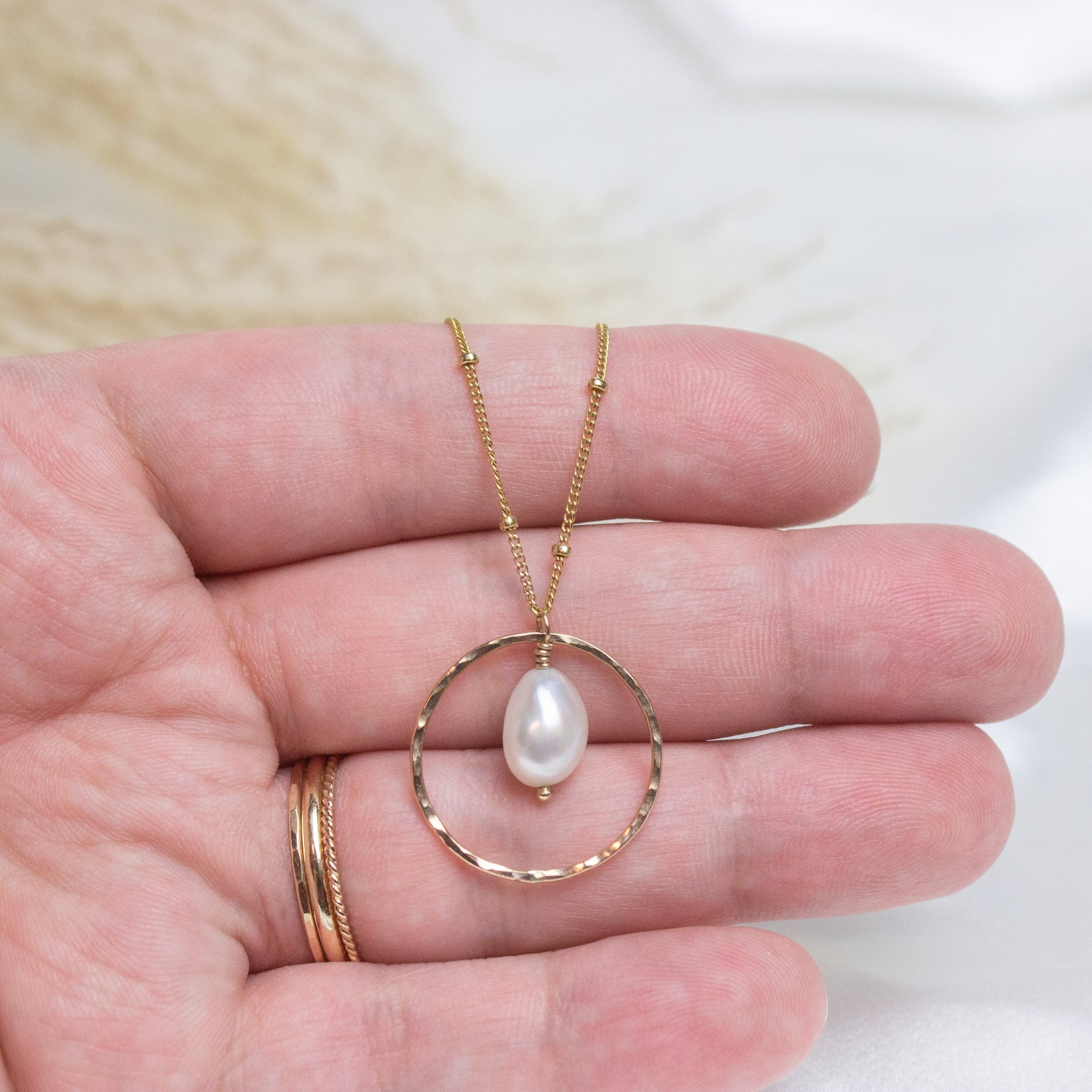 Hand soldered and hammered hoop with a large baroque Pearl in the center on a beaded satellite chain. Our most eye-catching pendant necklace!